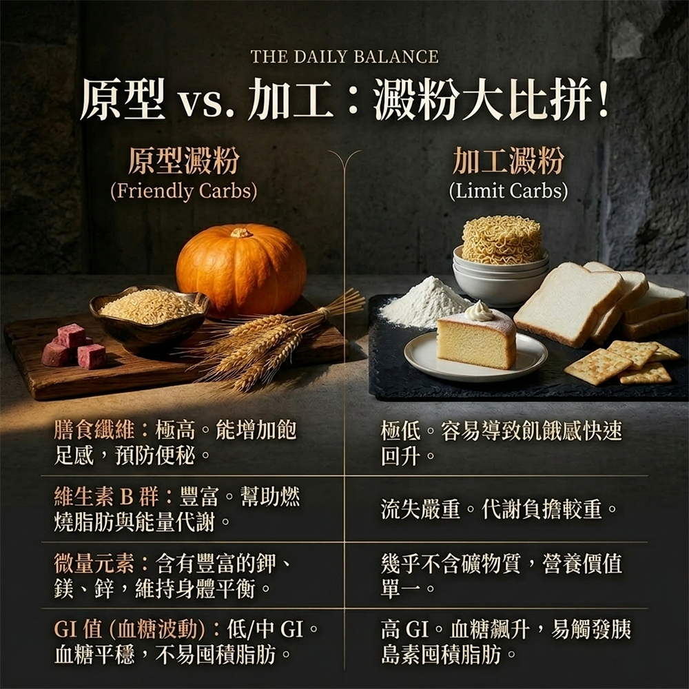 小編真心話: 很多人瘦不下來,是因為身體缺乏維生素 B 群來「幫忙燒火」。原型澱粉自帶 B 群,就像內建了燃脂助燃劑;而加工澱粉則是空熱量,吃多了反而讓代謝變得像在「爬坡」一樣吃力。