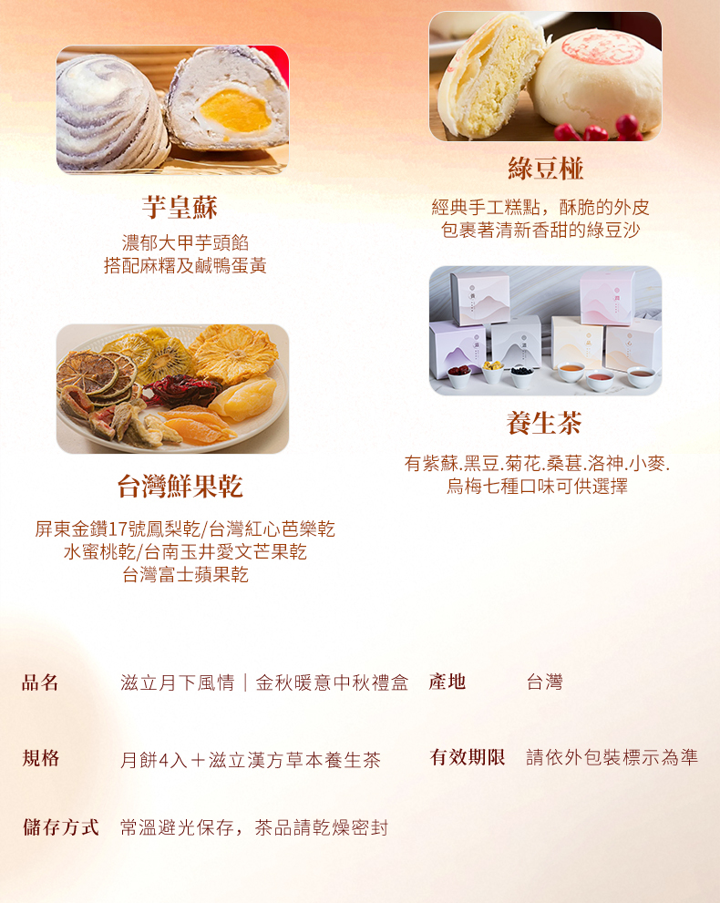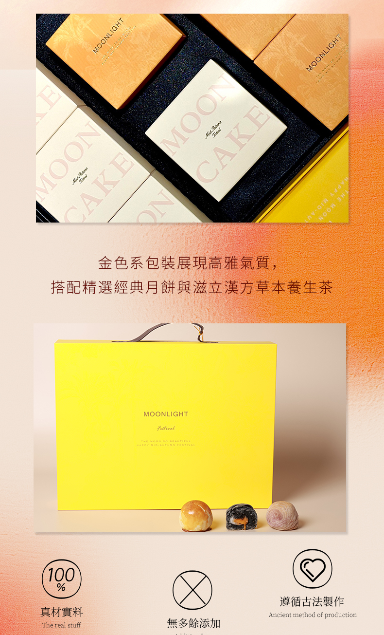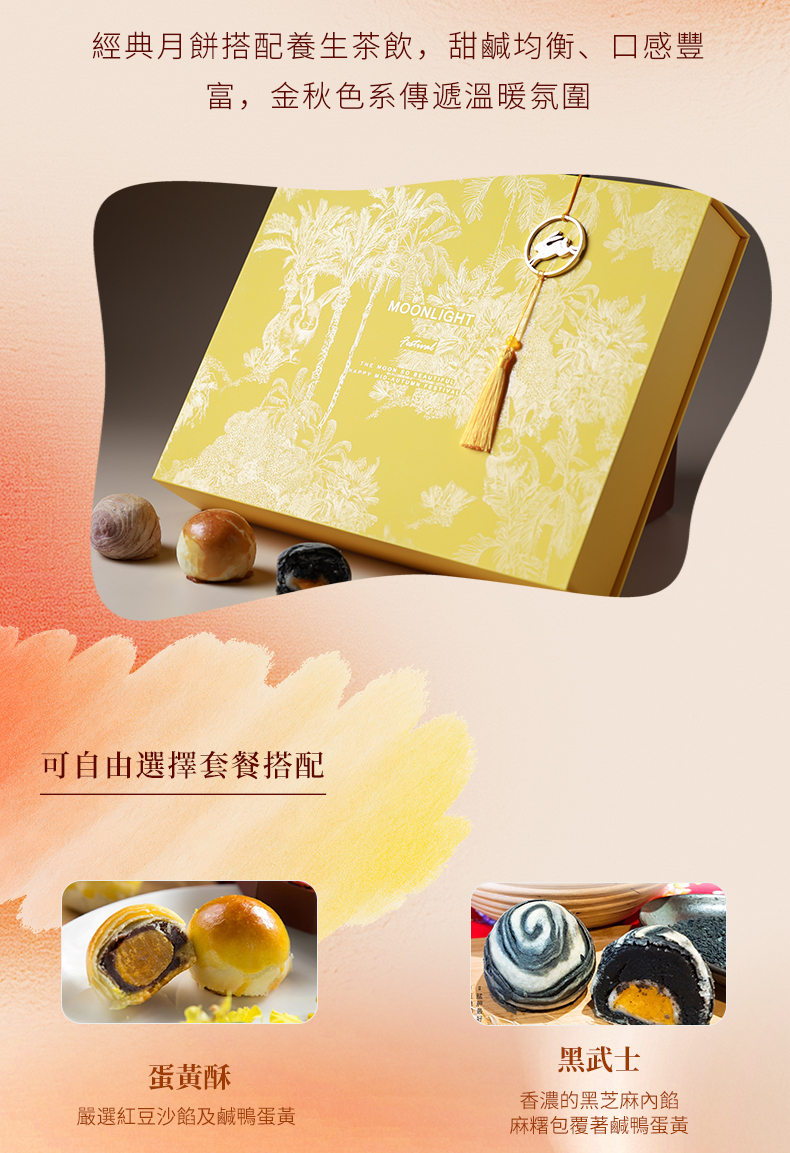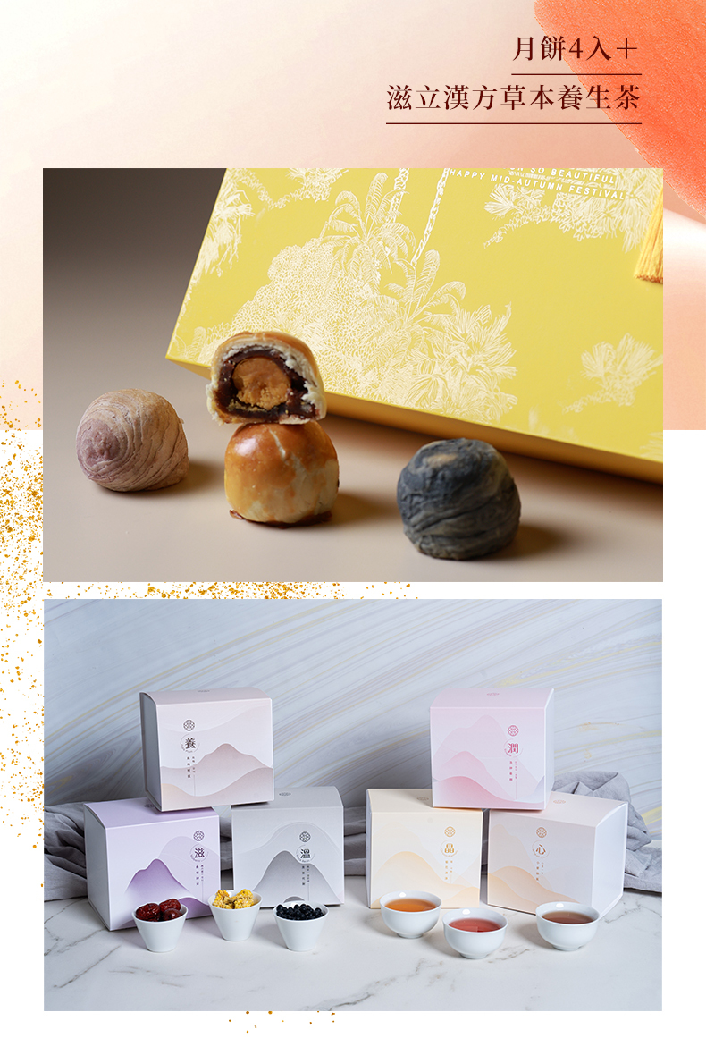 金色系包裝高雅大方,搭配4入精選經典月餅與滋立漢方草本養生茶,