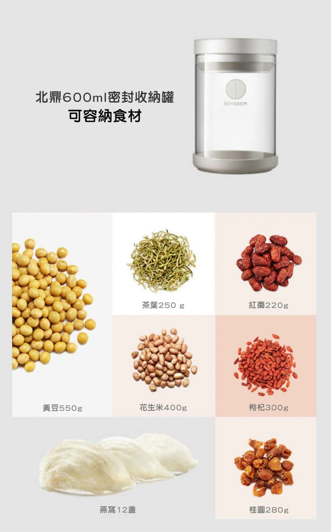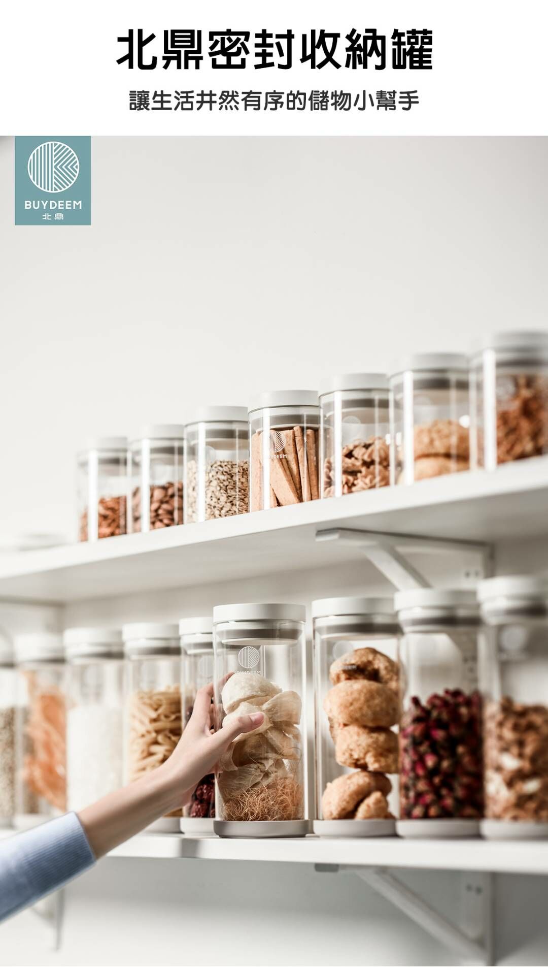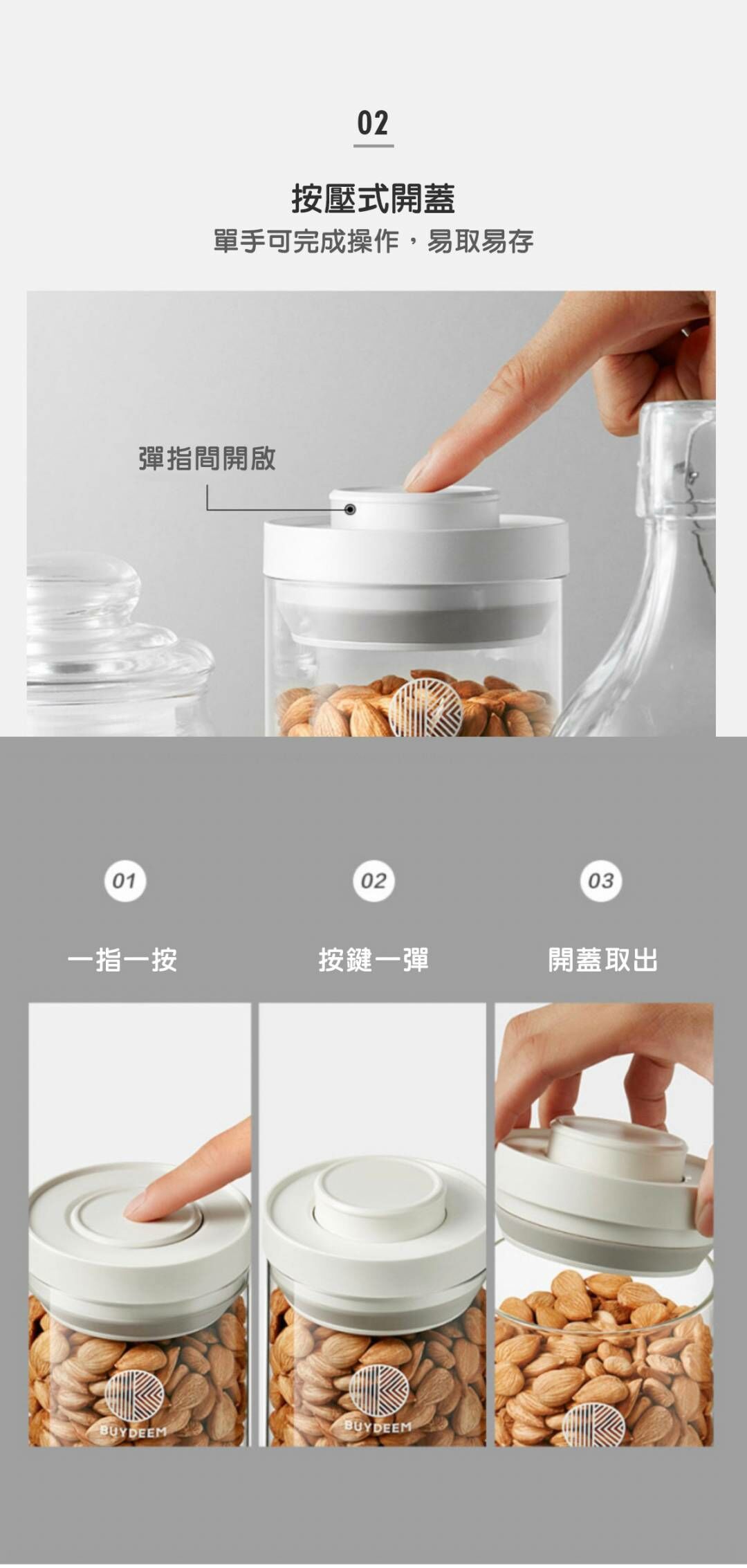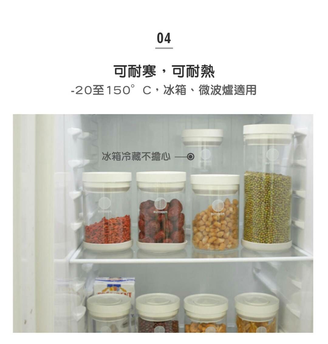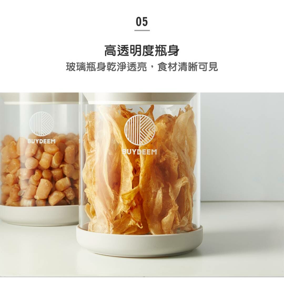 BUYDEEM北鼎密封收納罐-讓生活井然有序的儲物小幫手。按壓式開蓋讓你彈指間輕鬆開啟瓶罐,玻璃瓶身乾淨透亮,讓食材清晰可見。