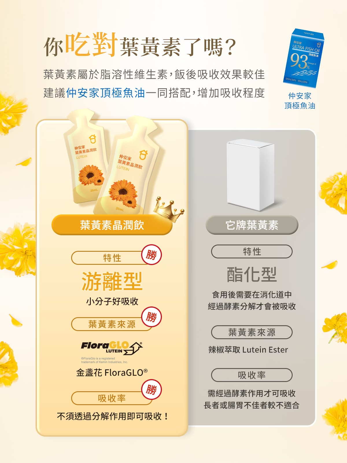 ⇨FloraGLO®游離型葉黃素,搭配仲安家頂級魚油吸收更好