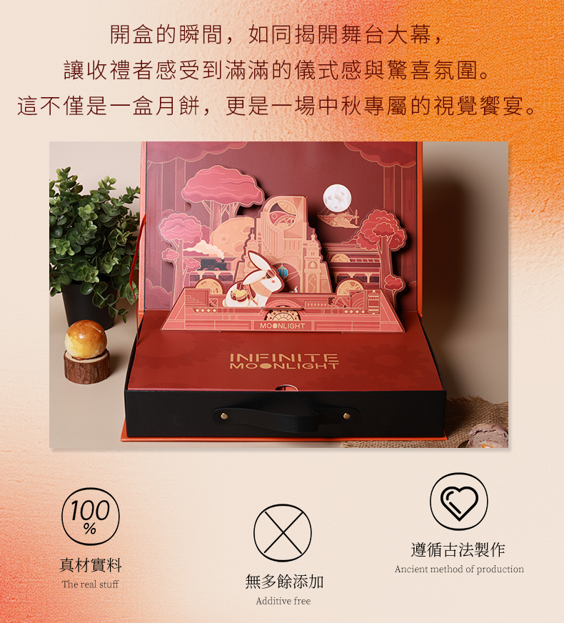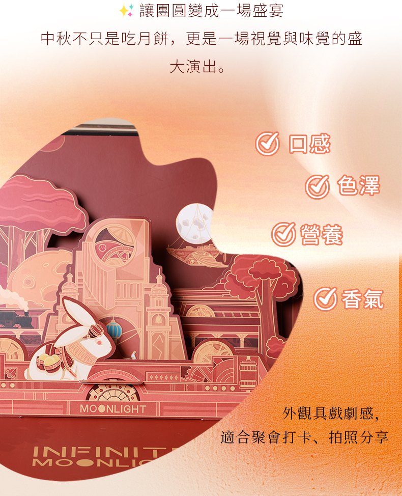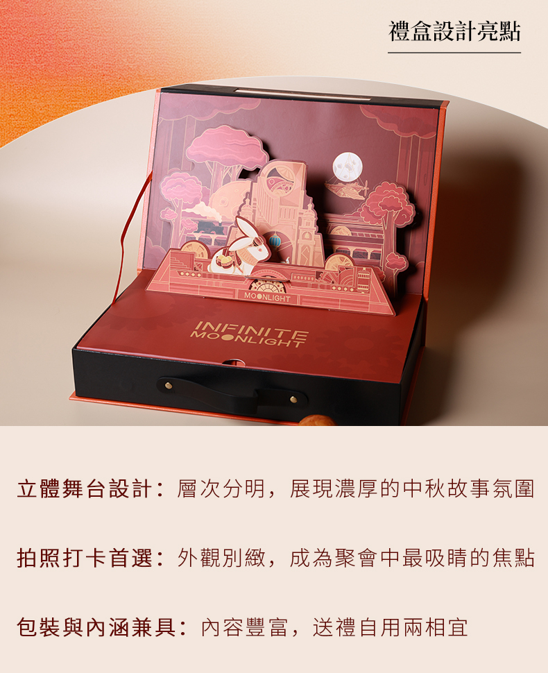 「中秋劇場」以戲劇式構圖與立體舞台設計為核心,開盒如同揭開大幕,將月色、舞台與節慶氛圍融合成一場專屬的中秋盛宴。